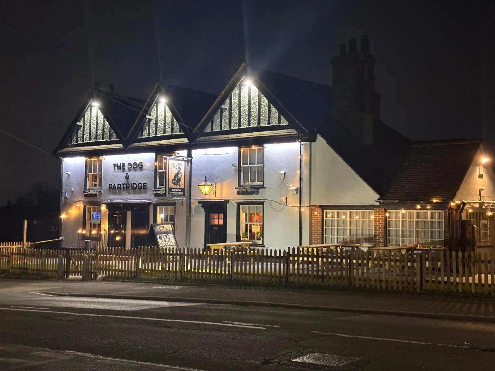 Inside, original beams, soft lighting, and an open fireplace create a cosy yet relaxed feel, while the spacious garden is a favourite in the warmer months. Sports fans can catch all the action across an expansive range of channels, and families are always welcome. Whether you're here for a pint after work, a Sunday roast, or a night of live entertainment, The Dog & Partridge delivers everything you’d expect from a proper local — and then some.